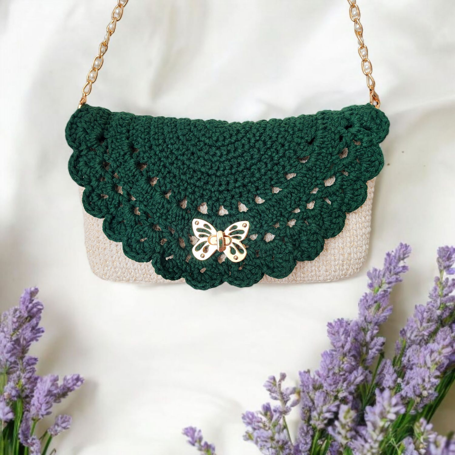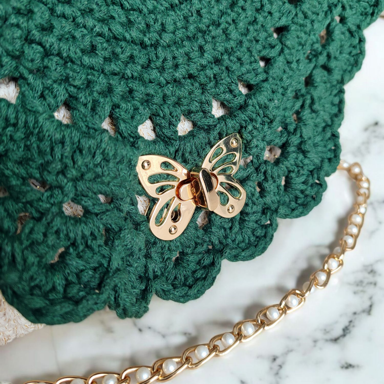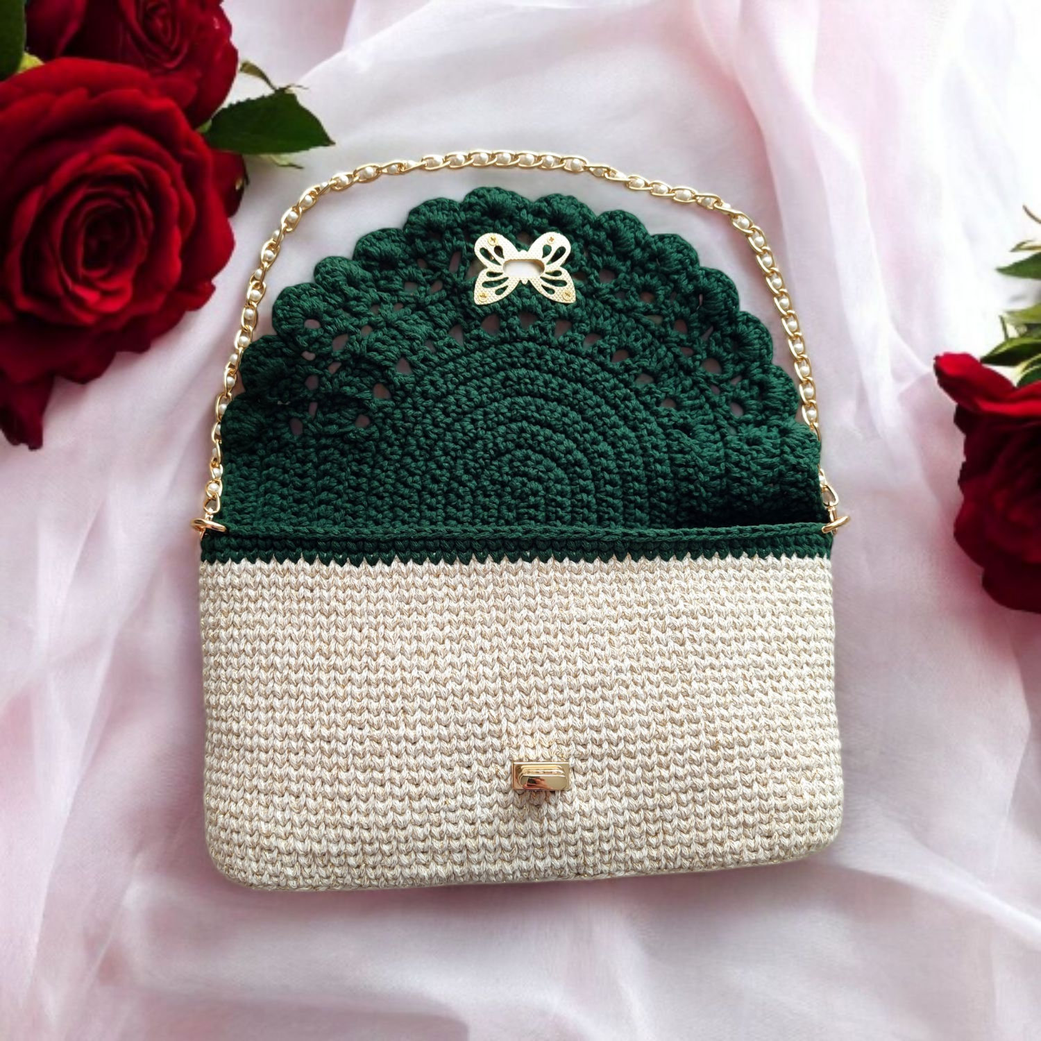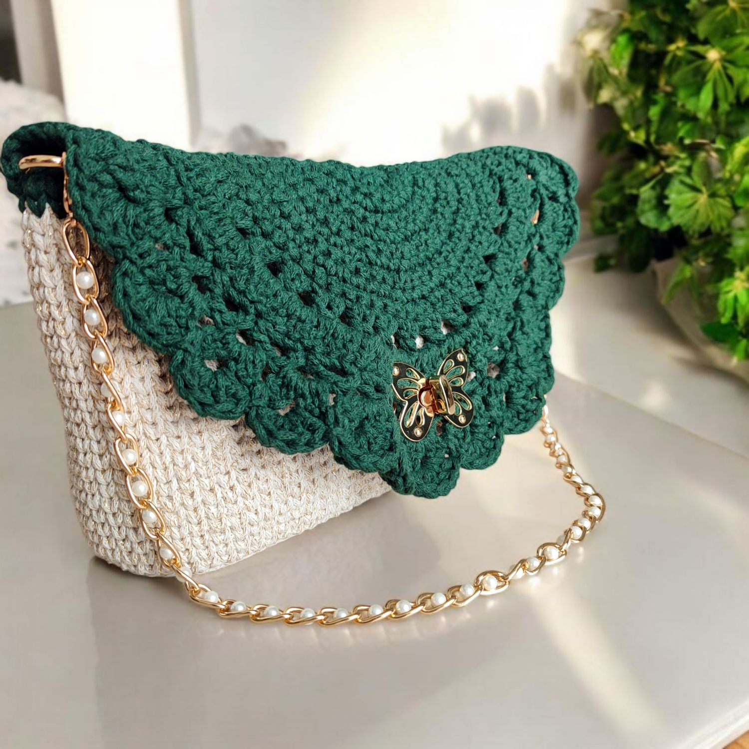 Ażurowa torebka z motylem jest ręcznie wykonana z wysokiej jakości, lekko połyskującego sznurka bawełnianego, dzięki czemu wygląda wyjątkowo, a przy tym zachwyca trwałością. Jej delikatna, ażurowa klapka w stylu boho przyciąga wzrok, ale to obrotowe zapięcie w kształcie motyla sprawia, że ta kopertówka wyróżnia się na tle innych. Klasyczna forma kopertówki w miękkim, ręcznie robionym wydaniu pięknie prezentuje się zarówno z letnią sukienką, jak i z elegancką stylizacją wieczorową.