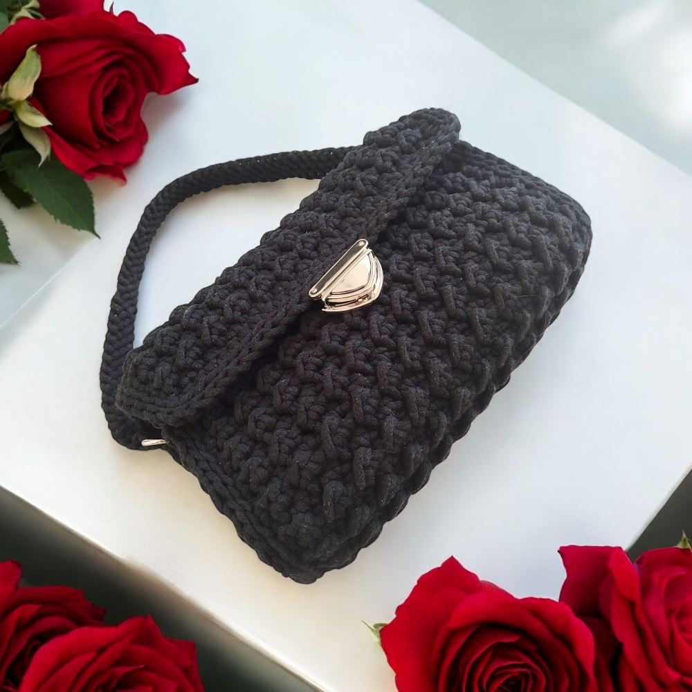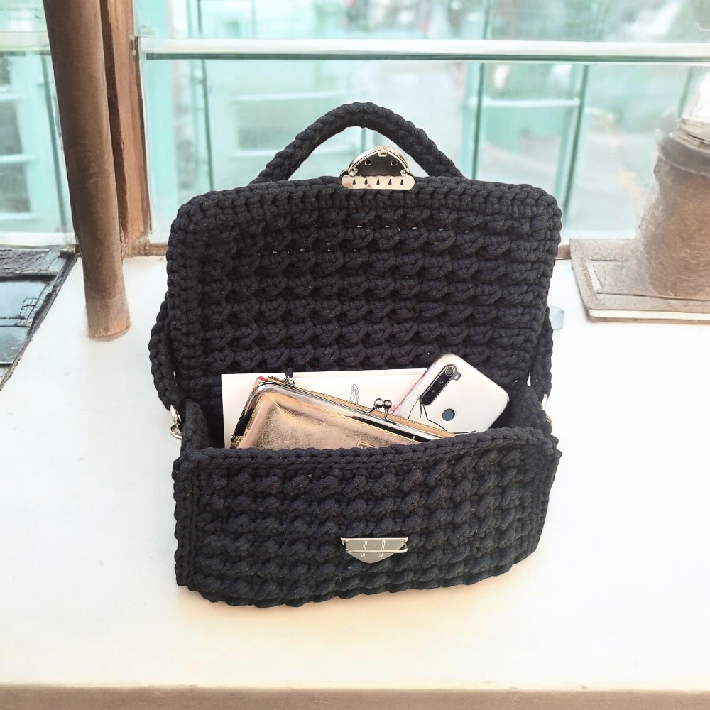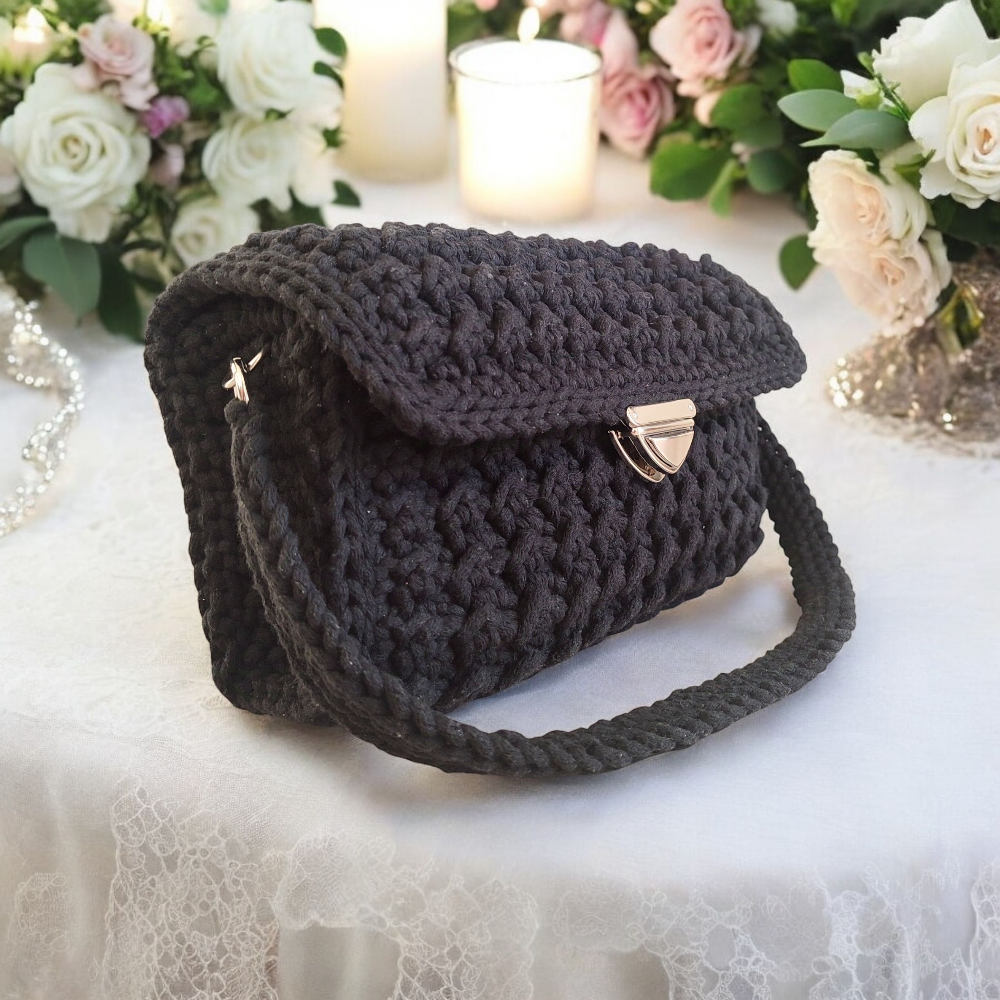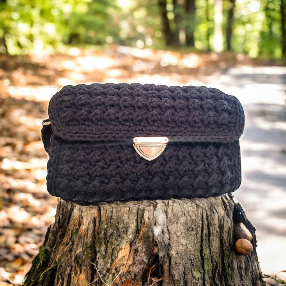 Czarna torebka kuferek wykonana ze sznurka bawełnianego to dodatek, który pokochasz za jej prostotę i elegancję. Jej ręczne wykonanie z wysokiej jakości naturalnego bawełnianego sznurka to gwarancja trwałości i wyjątkowego charakteru. Dzięki precyzyjnemu, niespotykanemu splotowi, torebka wyróżnia się na tle innych akcesoriów, dodając niepowtarzalnego uroku Twoim codziennym stylizacjom.