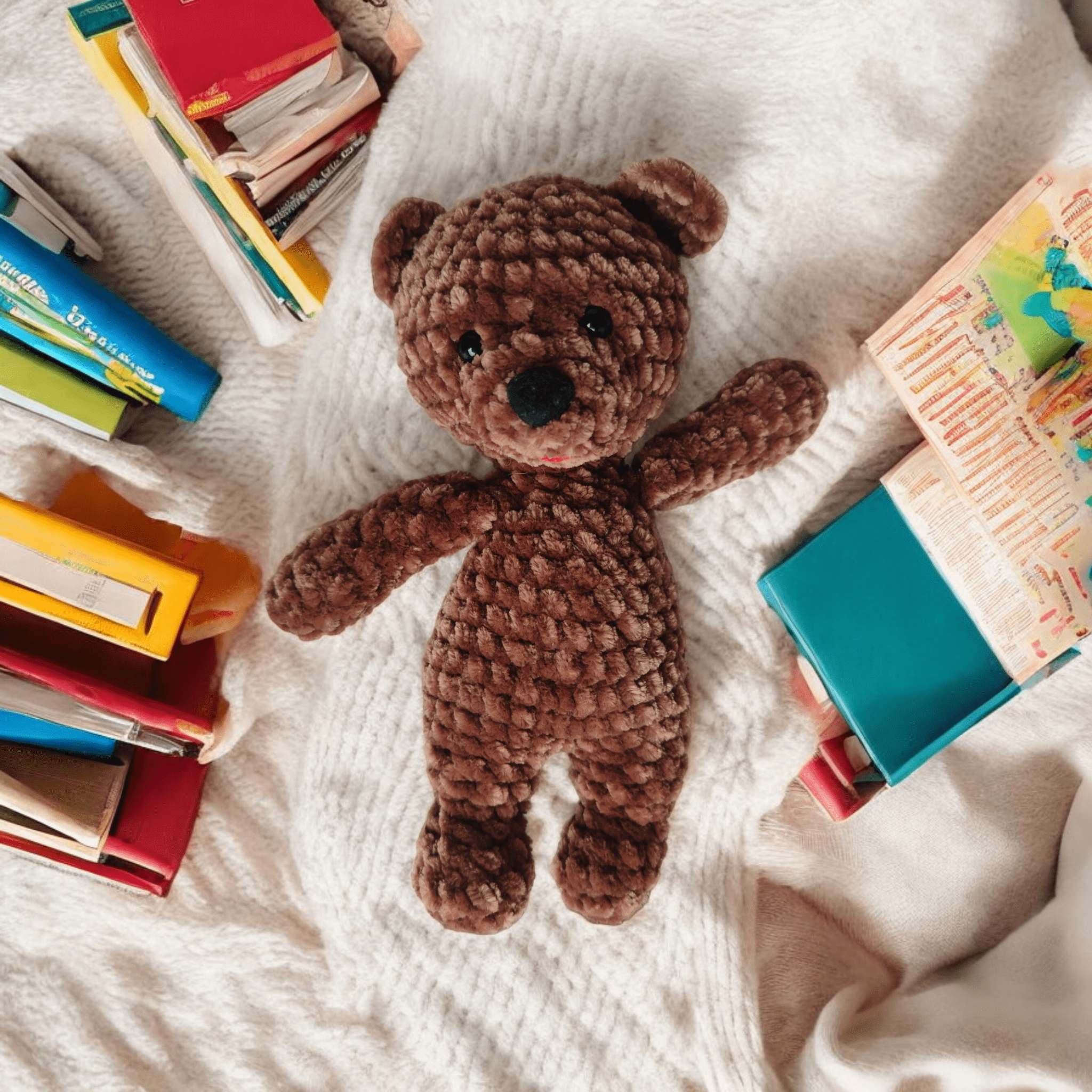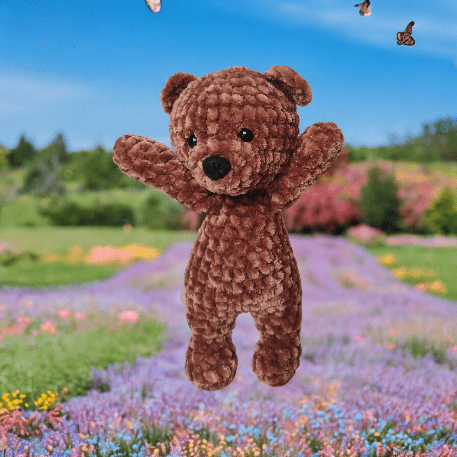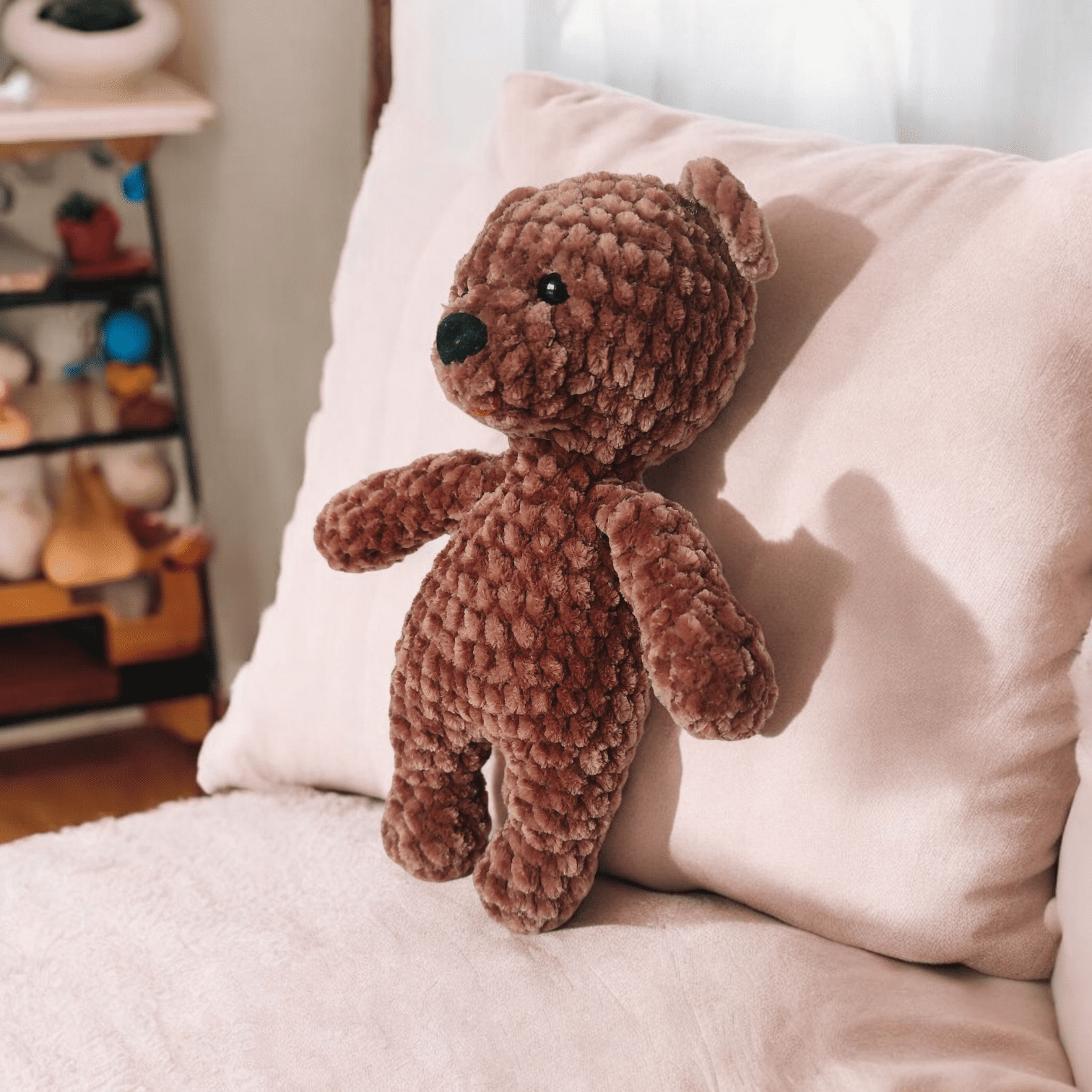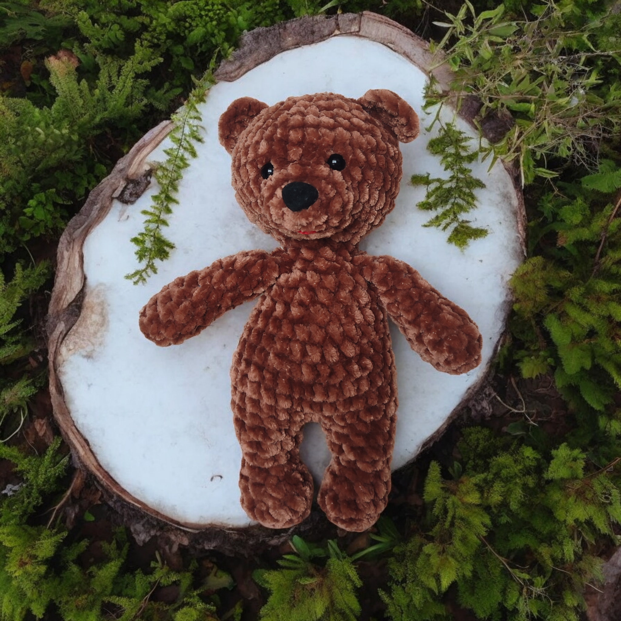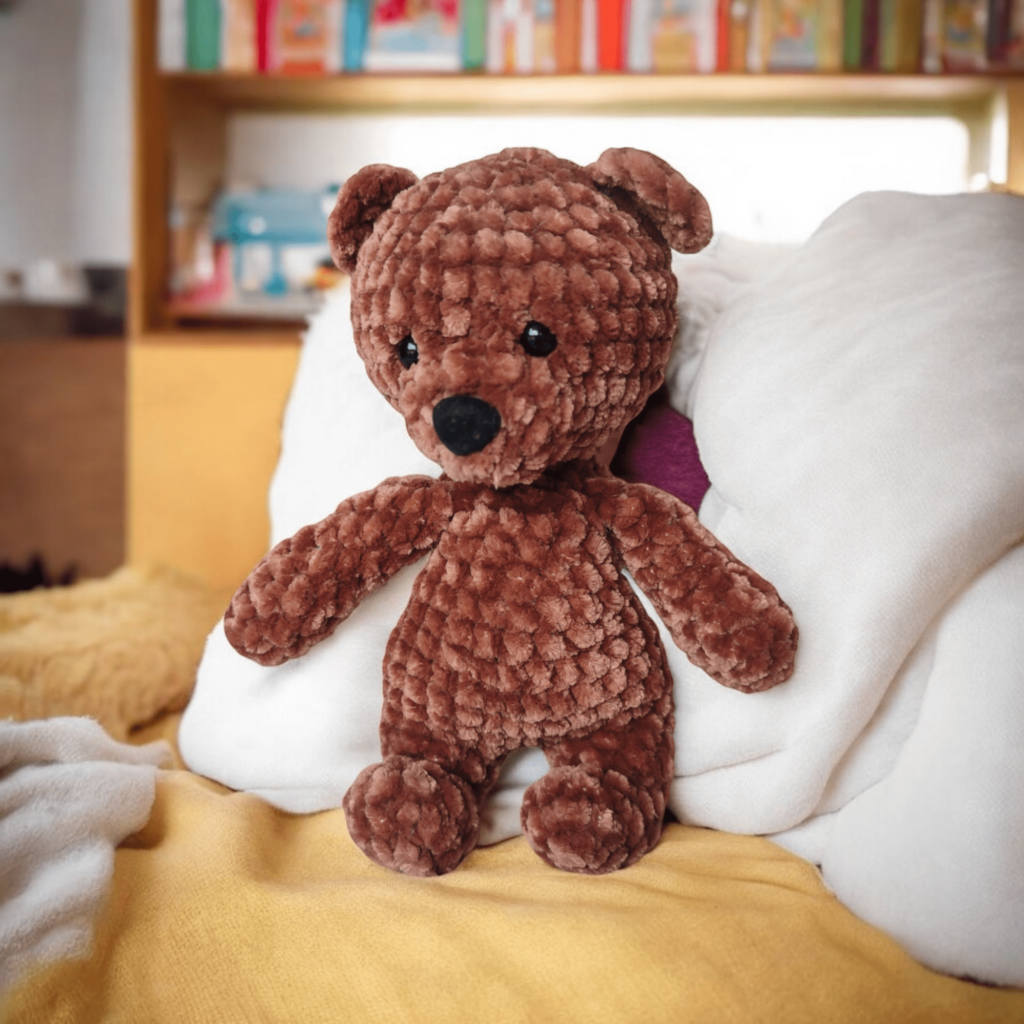Dodatkowym atutem pluszowego niedźwiadka jest jego wykonanie z aksamitnej włóczki, co sprawia, że w rezultacie jest on nie tylko mięciutki, ale także przyjemny w dotyku.