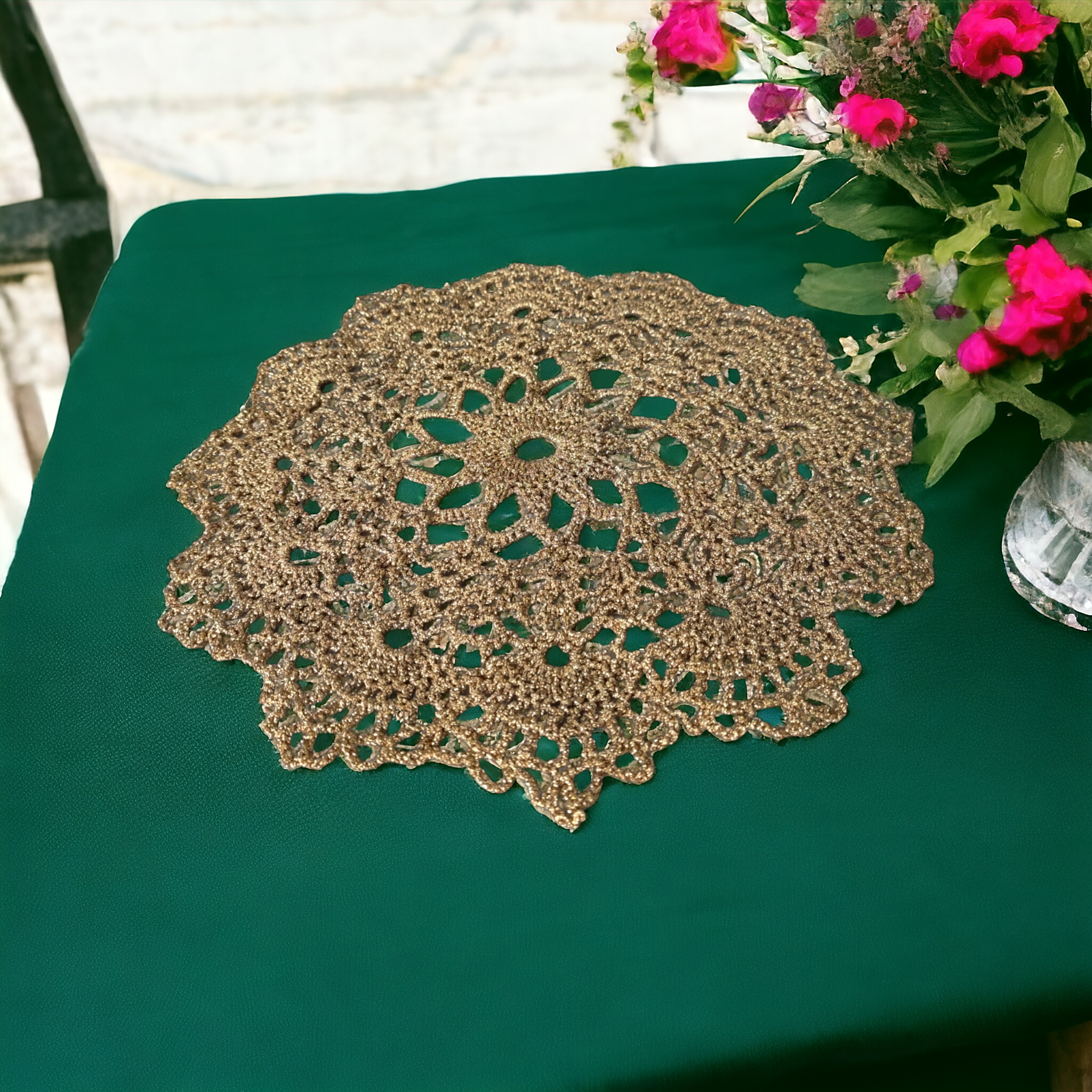 Serwetka okrągła złota mała świetnie sprawdzi się także jako codzienny dodatek do wystroju każdego wnętrza.
