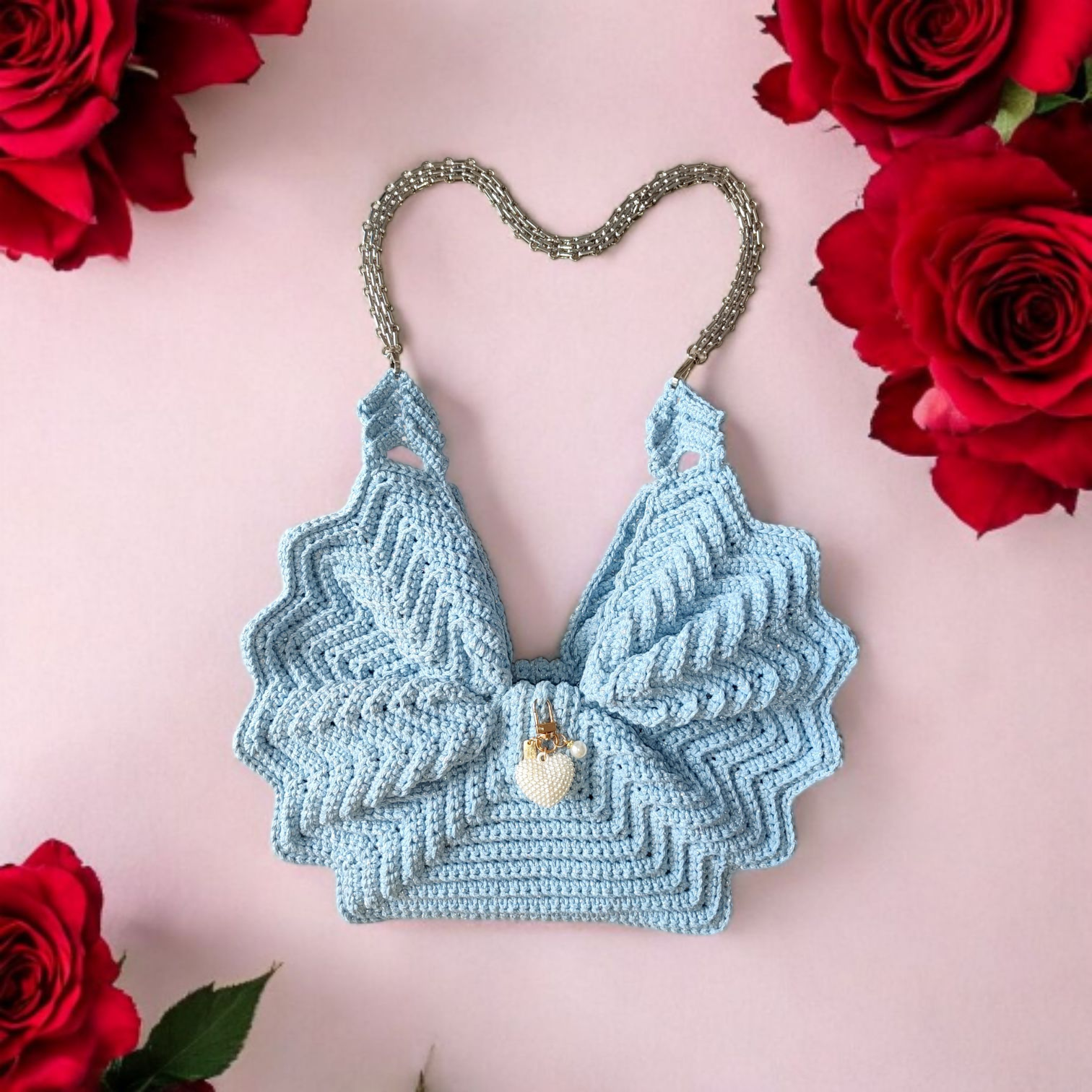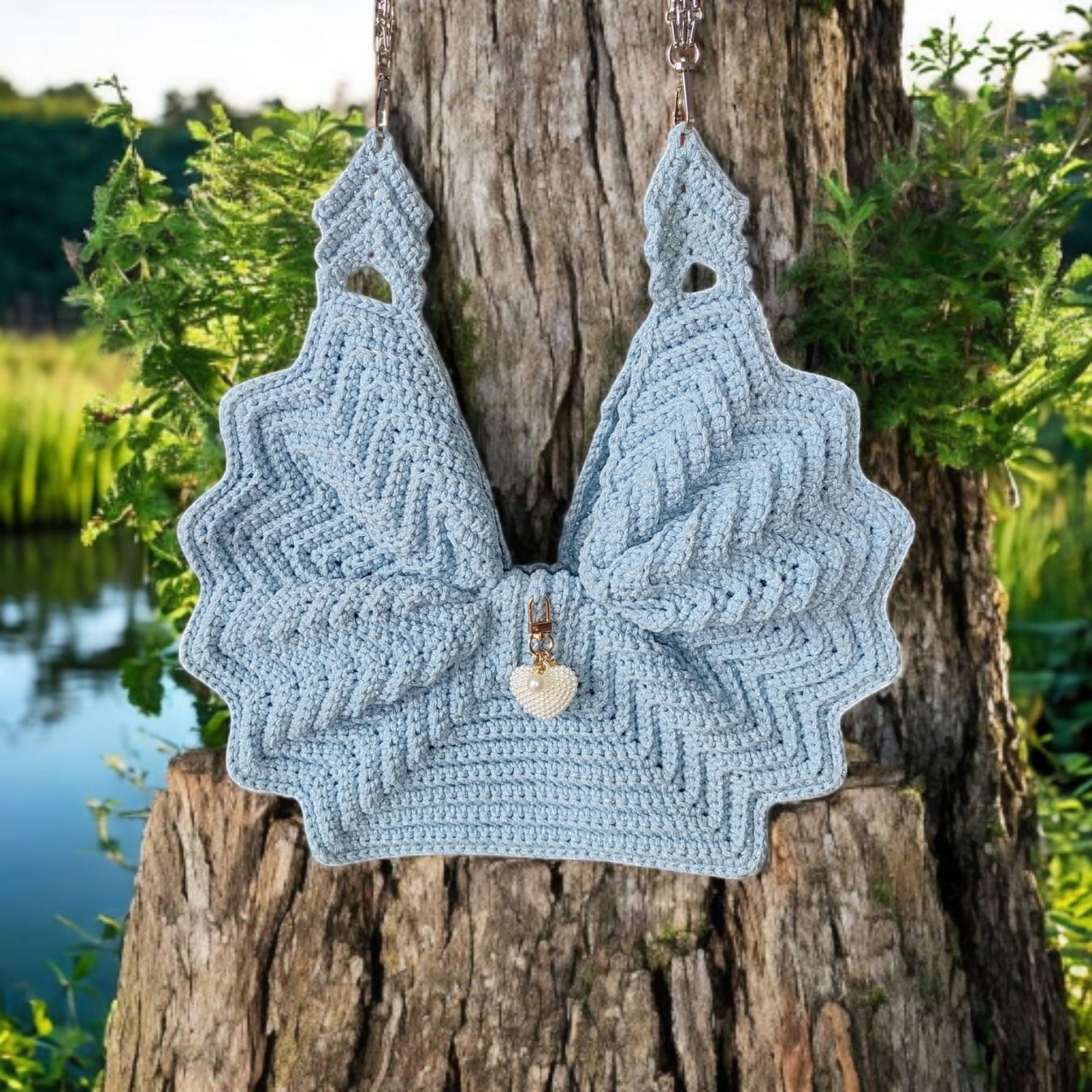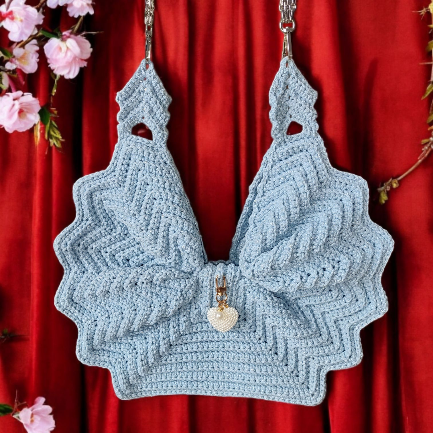 Szydełkowa torebka kokarda to połączenie tradycyjnego rzemiosła z nowoczesnym designem. Ręczne wykonanie, unikatowy kształt kokardy, wygodne magnetyczne zapięcie oraz elegancka błyszcząca nitka czynią ją stylowym i praktycznym dodatkiem do Twojej garderoby.