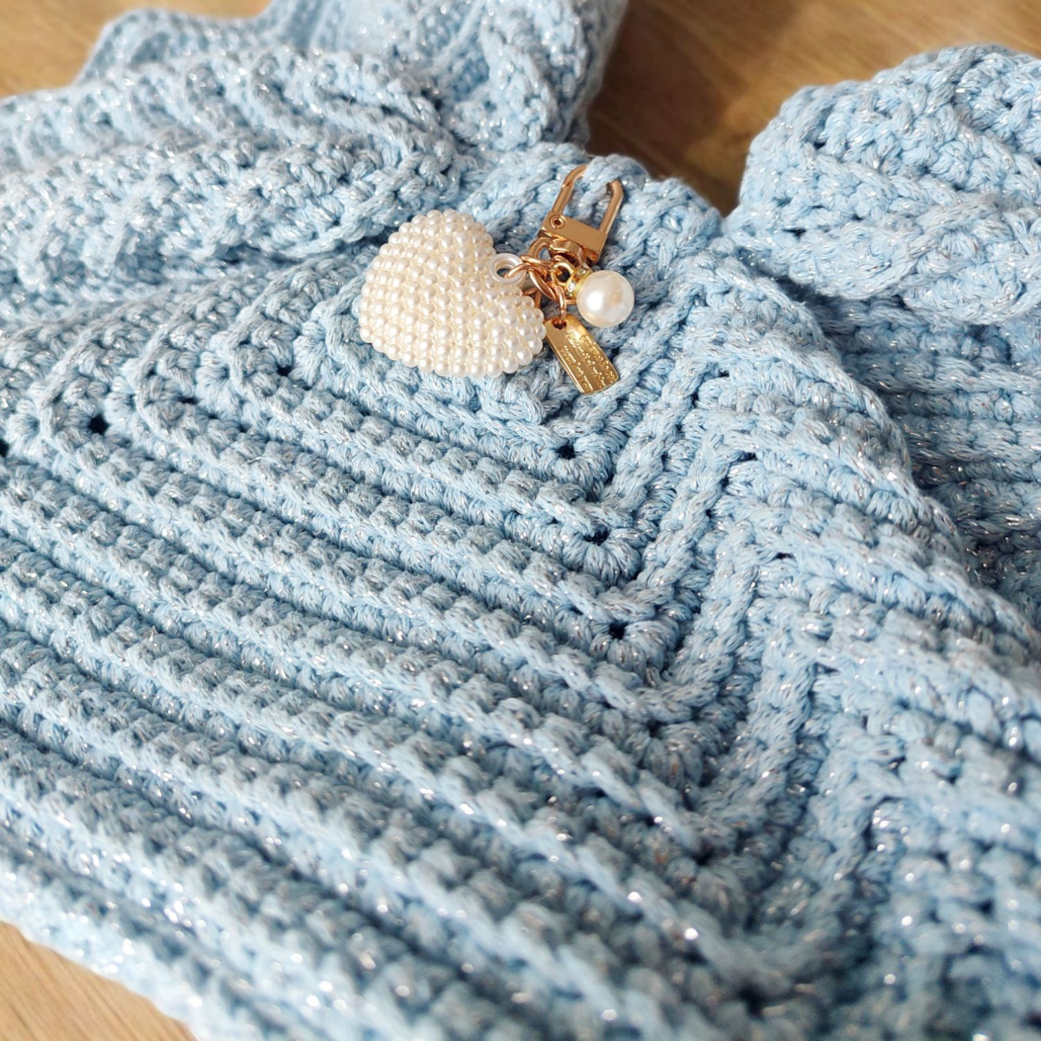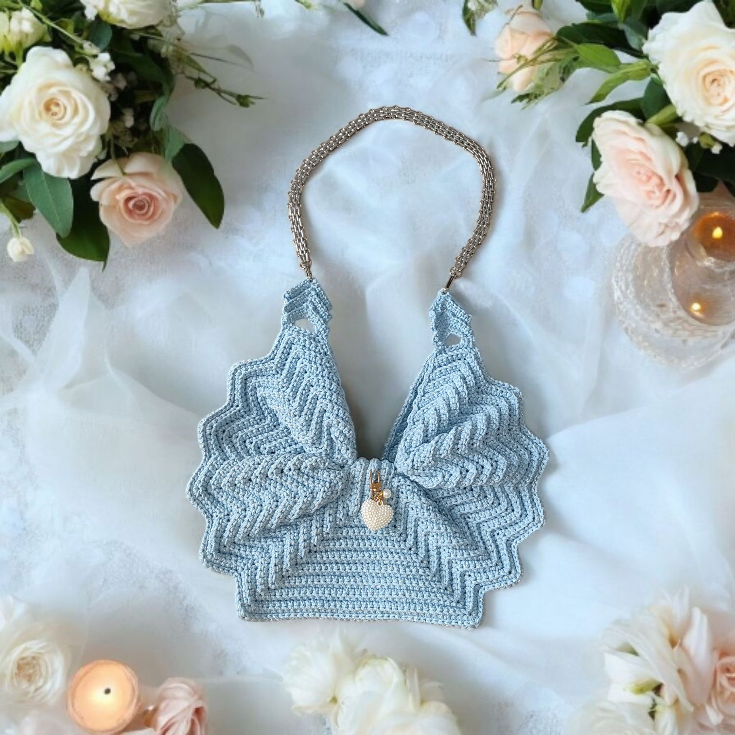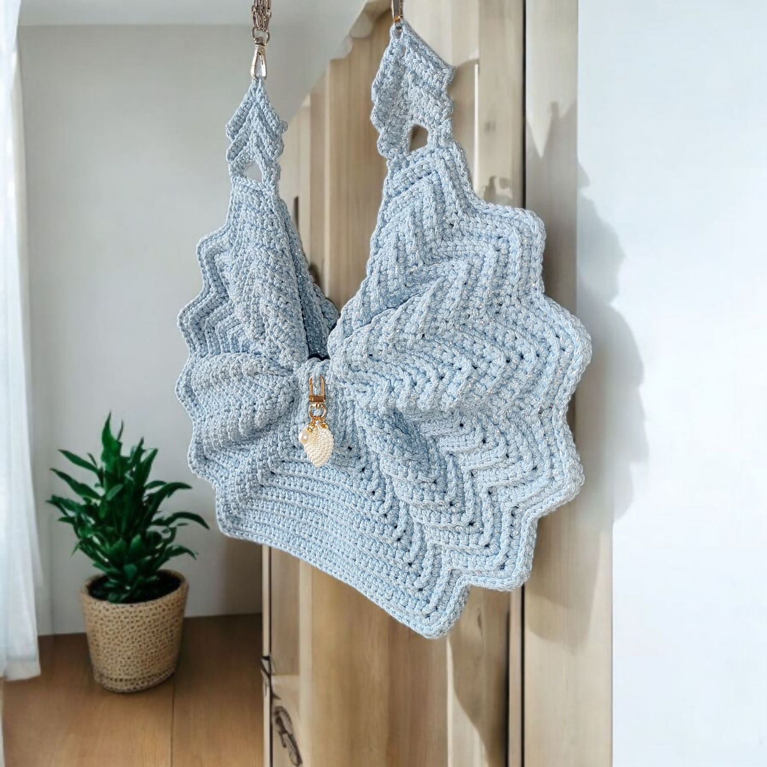 Szydełkowa torebka kokarda to połączenie tradycyjnego rzemiosła z nowoczesnym designem. Ręczne wykonanie, unikatowy kształt kokardy, wygodne magnetyczne zapięcie oraz elegancka błyszcząca nitka czynią ją stylowym i praktycznym dodatkiem do Twojej garderoby.